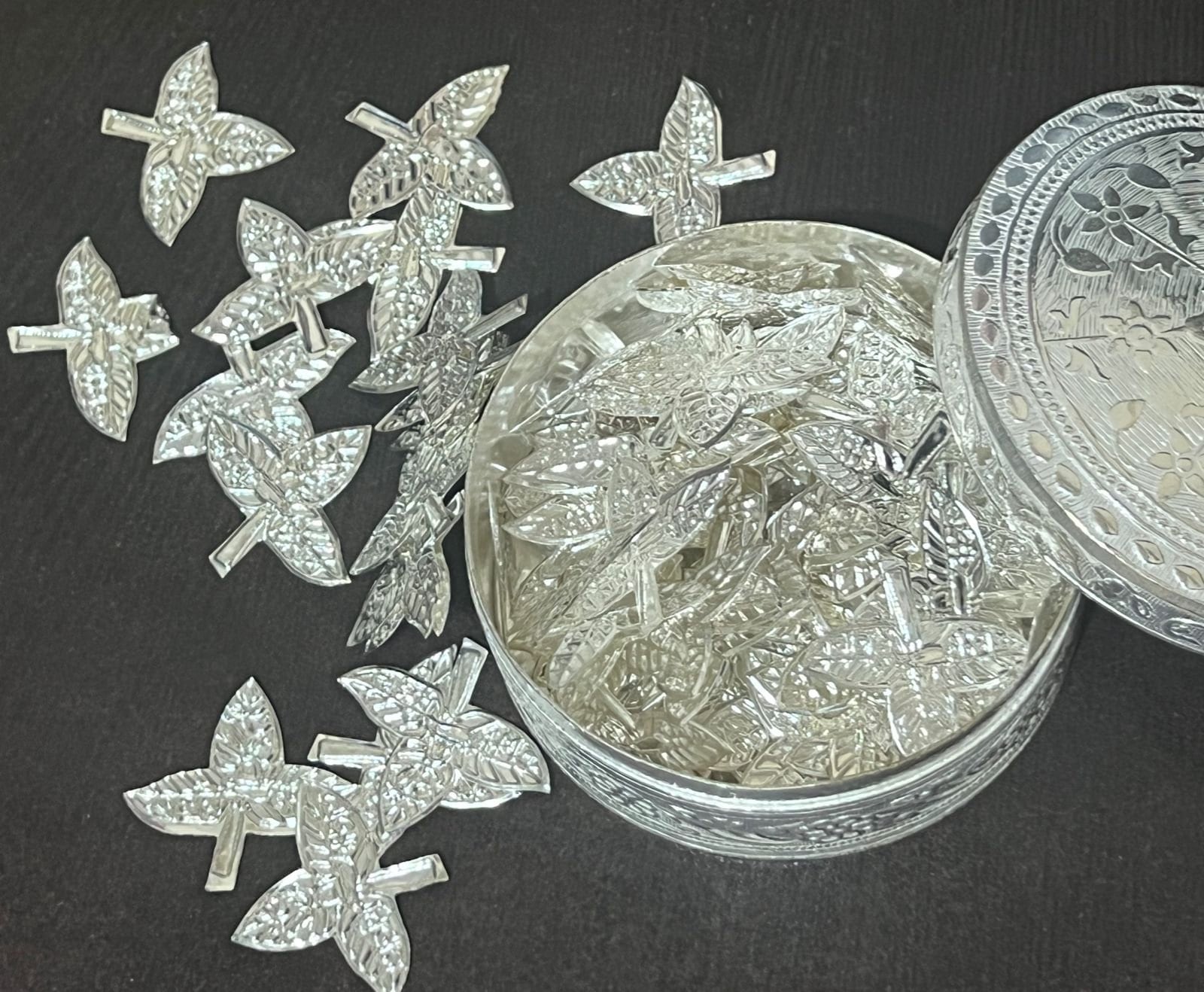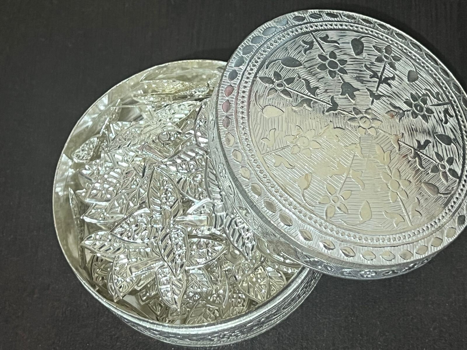 108 Bilva Patra/German Silver BIL PATRAM with ROUND box Om Namah Shivay/Silver Plated Bale Patra/Shiva/Bael Patra/Savan Somwar Pooja gift