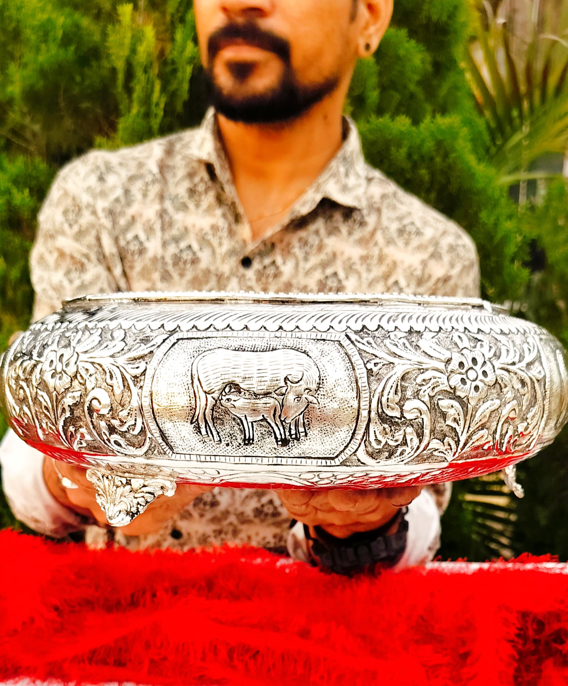 Discover the timeless elegance of this exquisite Antique German silver cow calf engraved Urli. Handcrafted with meticulous attention to detail, this decorative vessel showcases intricate engraving work that captures the graceful form of a calf. The German silver construction ensures durability and a lustrous finish that develops character with age. Perfect for collectors of vintage metalware or those seeking a distinctive accent piece, this Urli blends traditional craftsmanship with artistic sophistication. An investment in heritage and artisanal excellence.