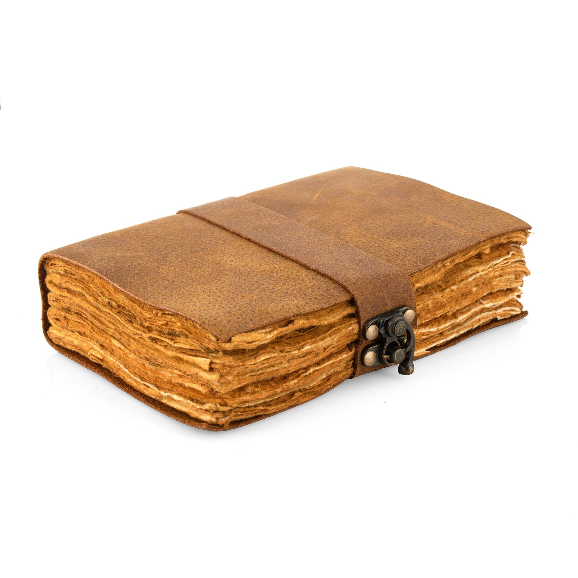 Genuine Premium Leather & Deckle edge Paper : Authentic leather journal, naturally tanned with special oil and slightly distressed, giving it an Rustic look, like it’s been passed down for years. This Old Fashioned Deckle Edge Paper is BLANK recycled cotton that is acid-free, chemical-free and tree-free. This gorgeous, thick antiqued paper prevents bleed-through and feels amazing. Environmentally sensitive and fountain pen friendly.