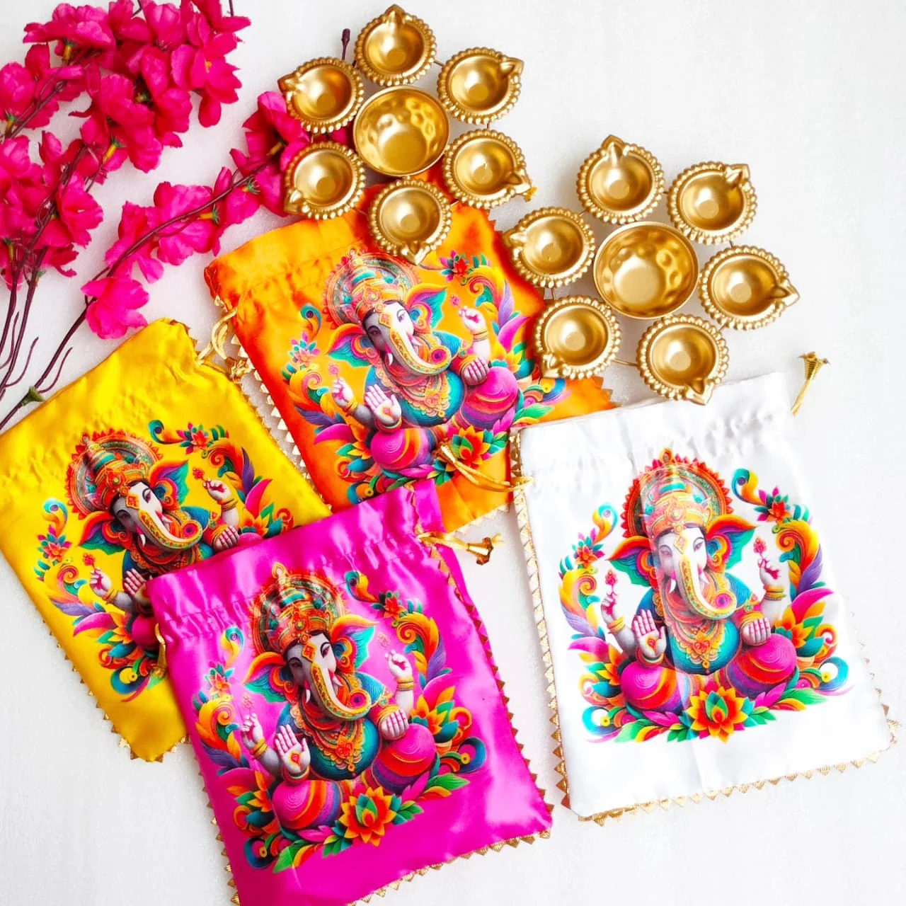 - Ganesh Ji Printed Potli Bag: Each potli bag is adorned with a beautiful Ganesh G print, symbolizing prosperity and blessings. Made from high-quality fabric, it exudes elegance and is spacious enough to hold your precious gifts.
