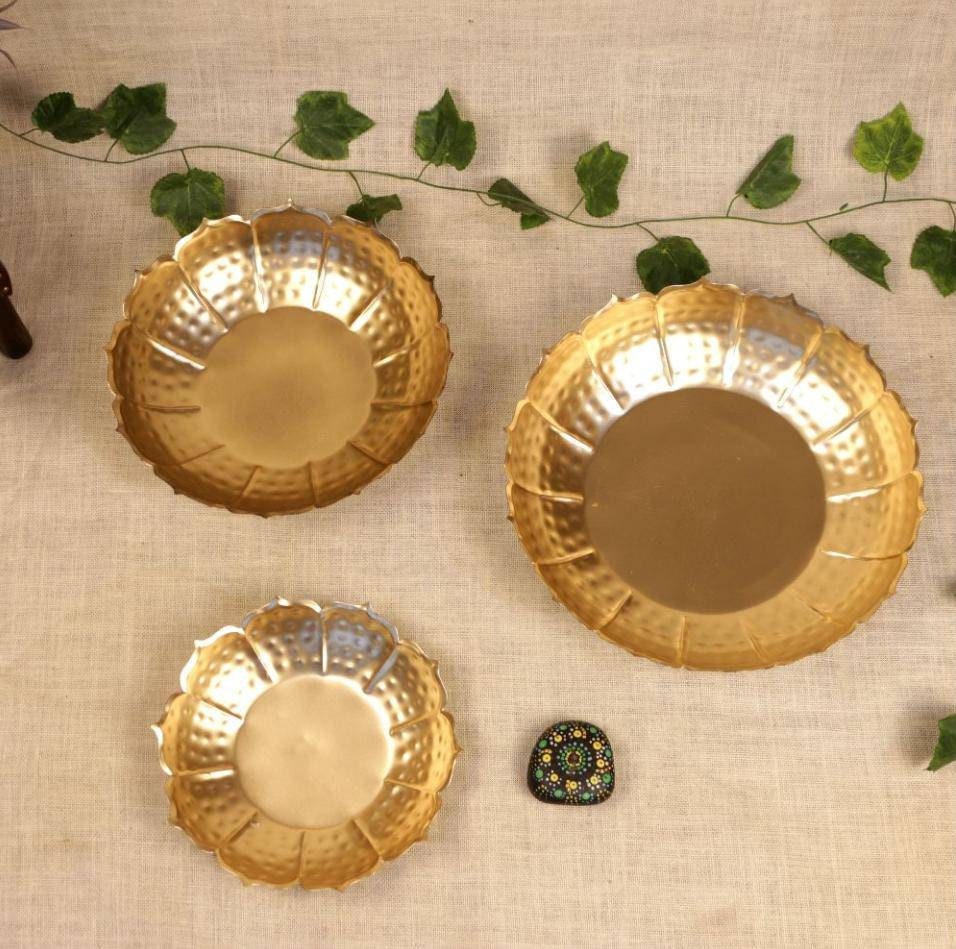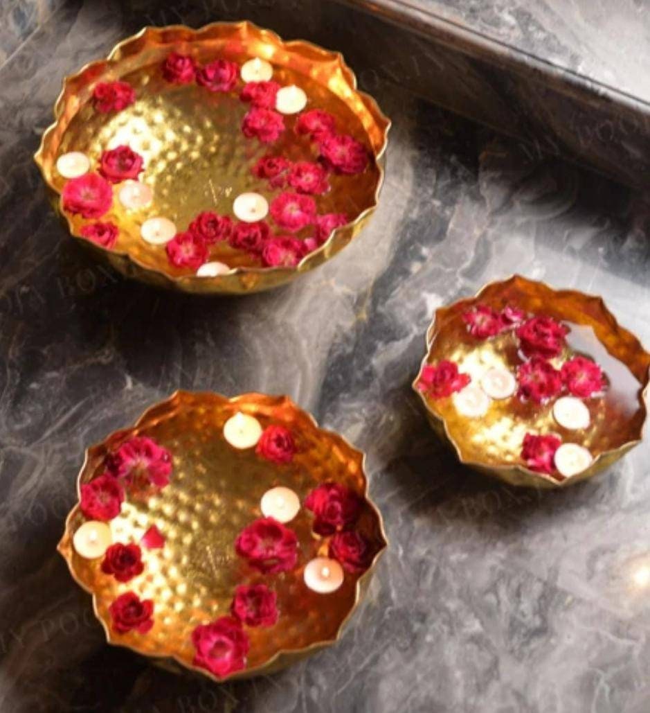 • metal urili with t light diya for diwali decoration • home office decoration indoor outdoor decor • golden urili /urli set for decoration wedding decor • Gift item Urlis Diwali Holi Festive Decor set of 3 piece